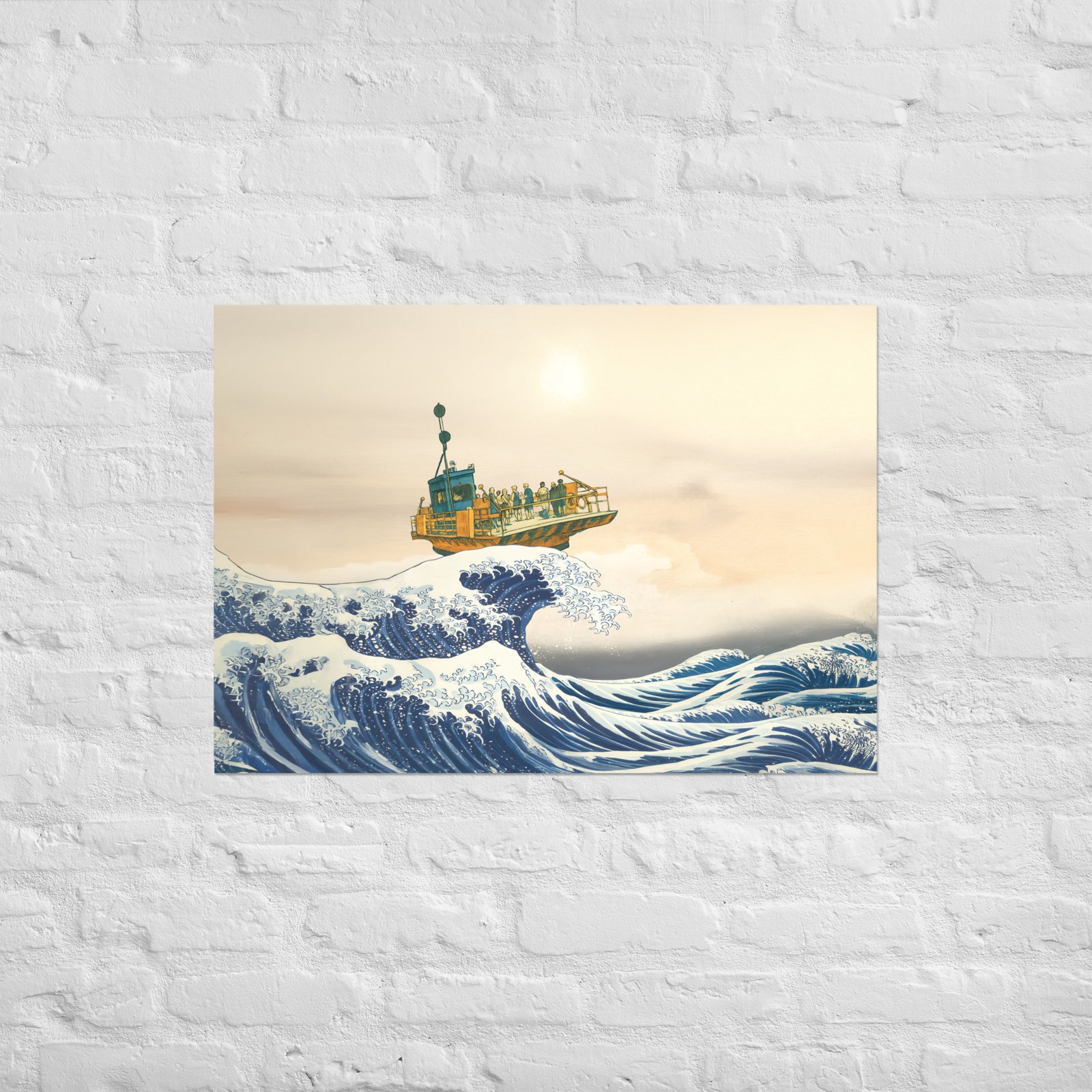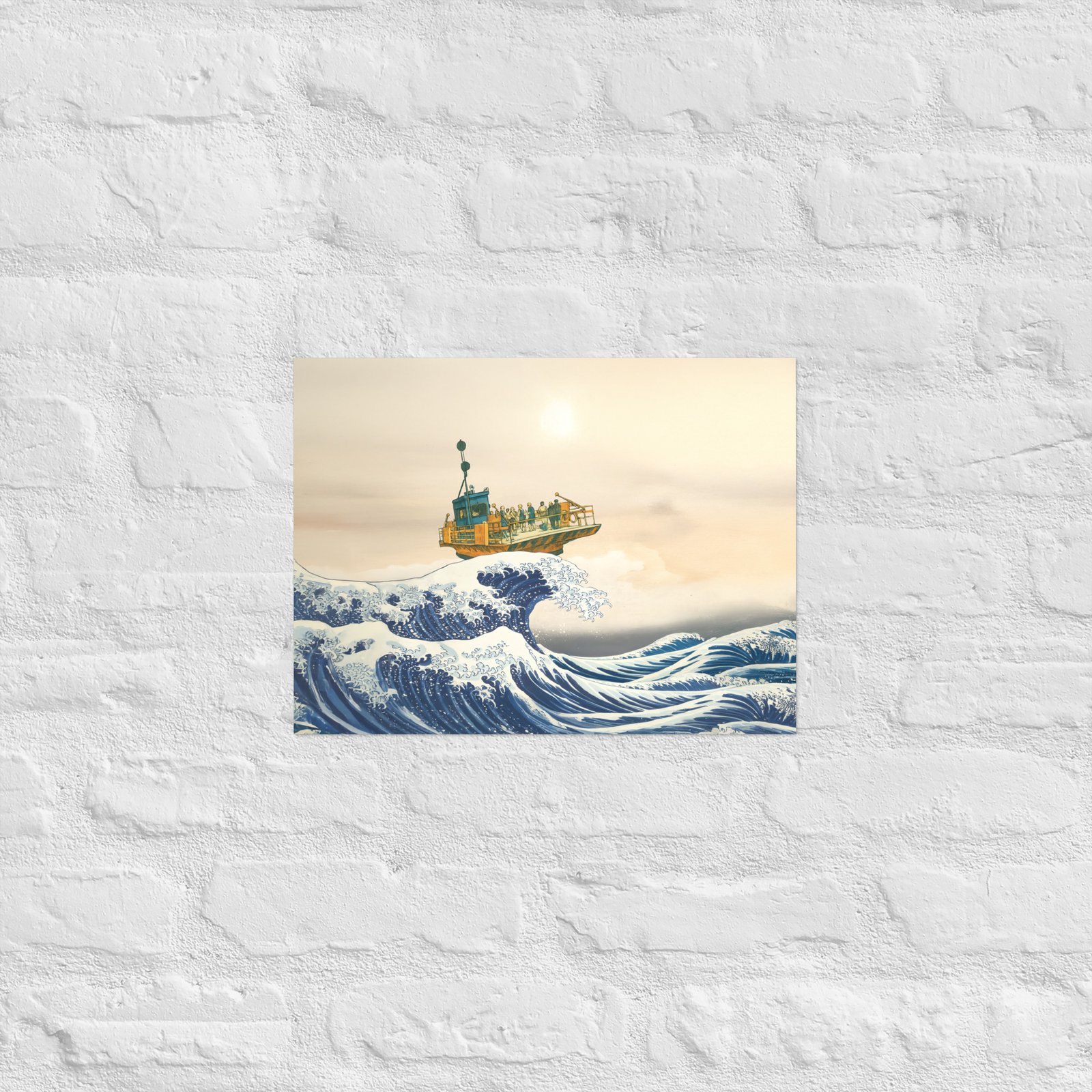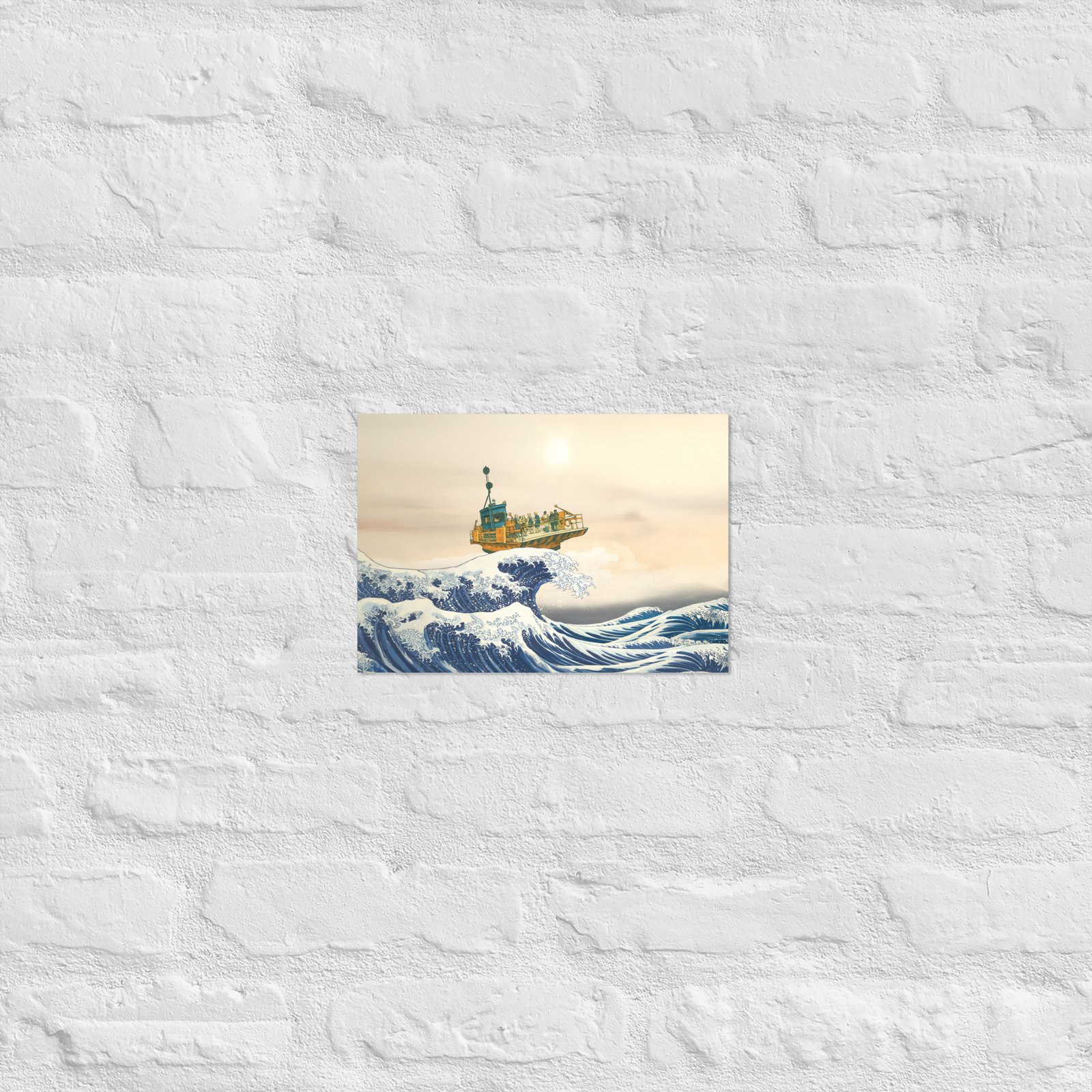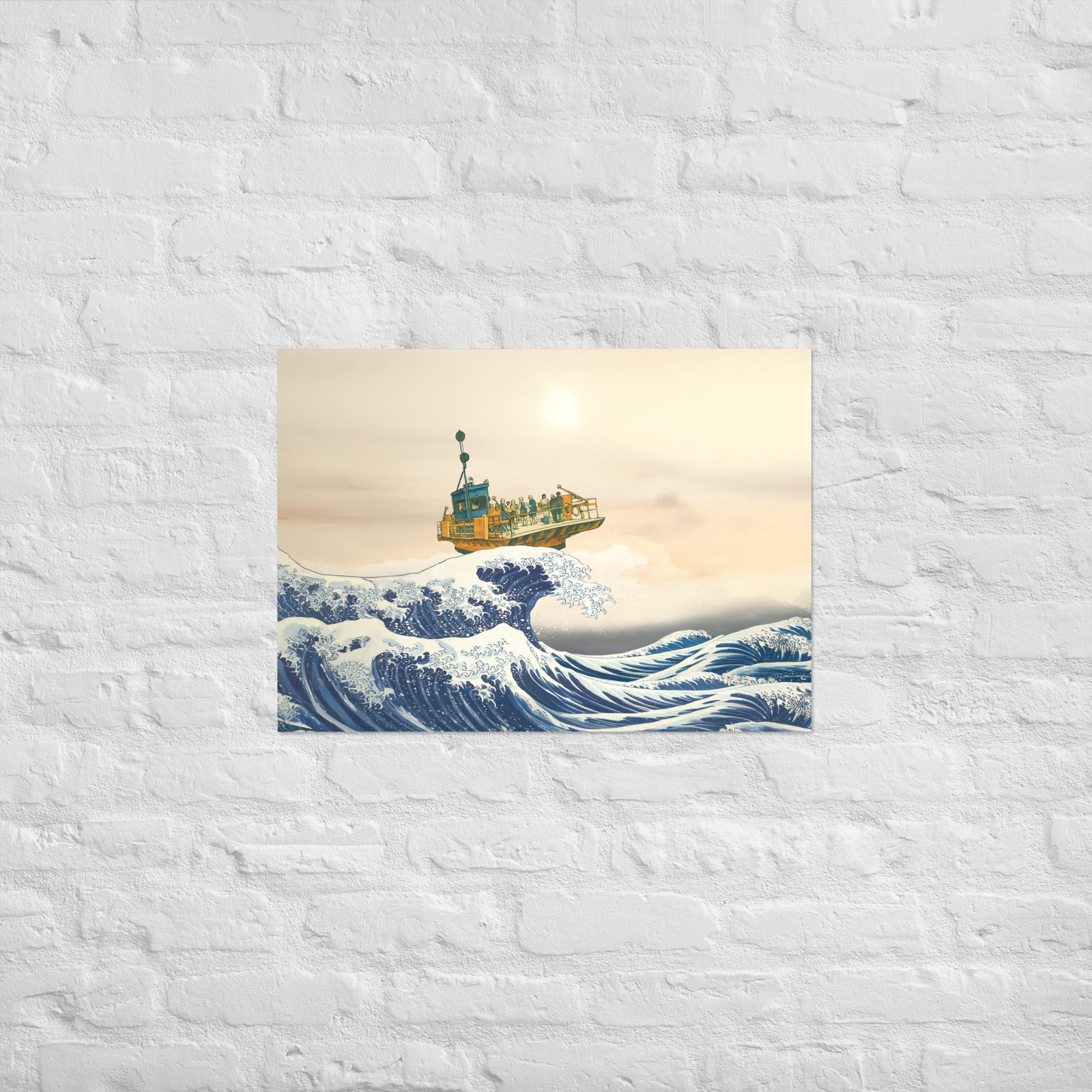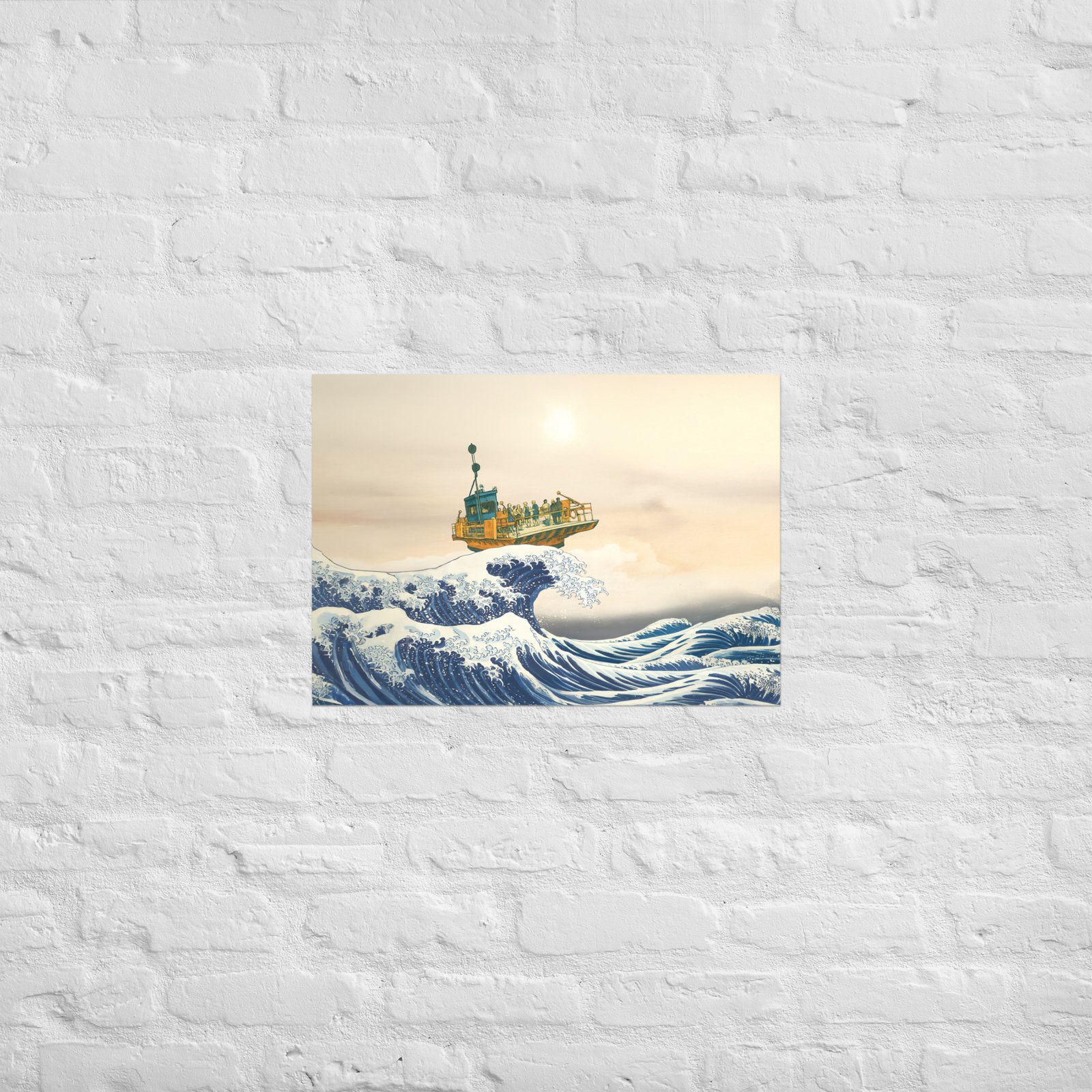 Föri Aalloilla ei ole pelkkä kuva seinällä. Se on liikkeessä oleva legenda, joka lipuu pitkin Hokusain jättimäistä aallokkoa kuin se olisi tehnyt niin aina. Tässä julisteessa Aurajoen ylpeydenaihe Föri kohtaa japanilaisen taidehistorian suurimman vesielementin tavalla, joka saa sisustuksen hyrskymään. Eikä huolta, tulva ei yllä lattialle asti.