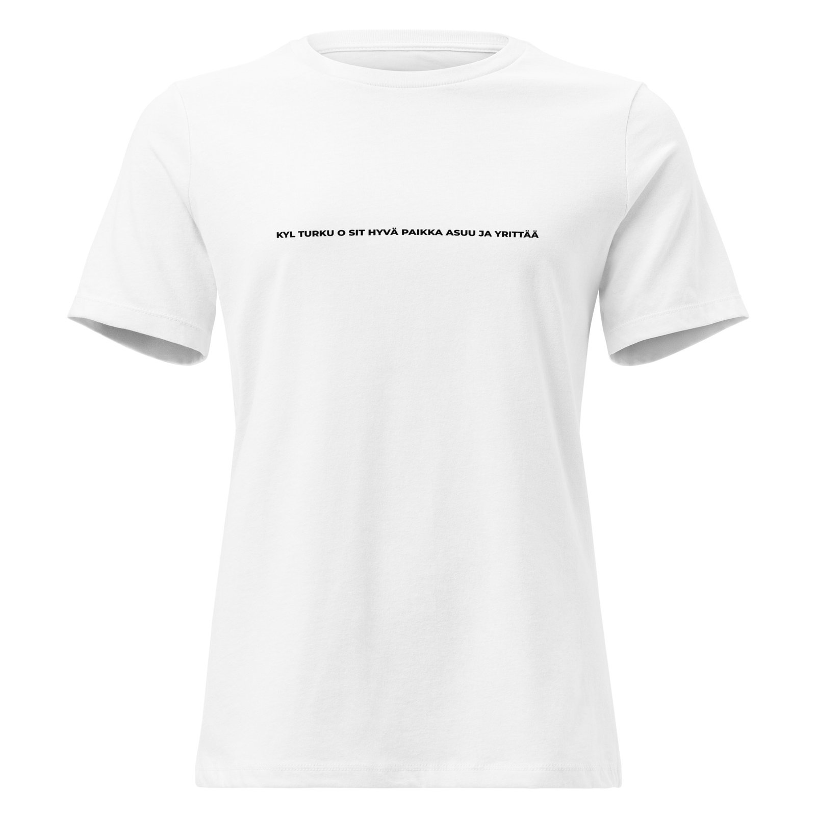 Naisten T-paita – Kyl Turku o sit hyvä paikka asuu ja yrittää ei kiertele eikä kaartele. Se sanoo suoraan sen, mitä moni miettii ja harva uskaltaa pukea sanoiksi – tai paidaksi. Joku Levoton sanoi tämän joskus, ja nyt se on ikuistettu yhdelle riville, keskelle rintaa, juuri siihen kohtaan missä tunne Turusta yleensä asuu.