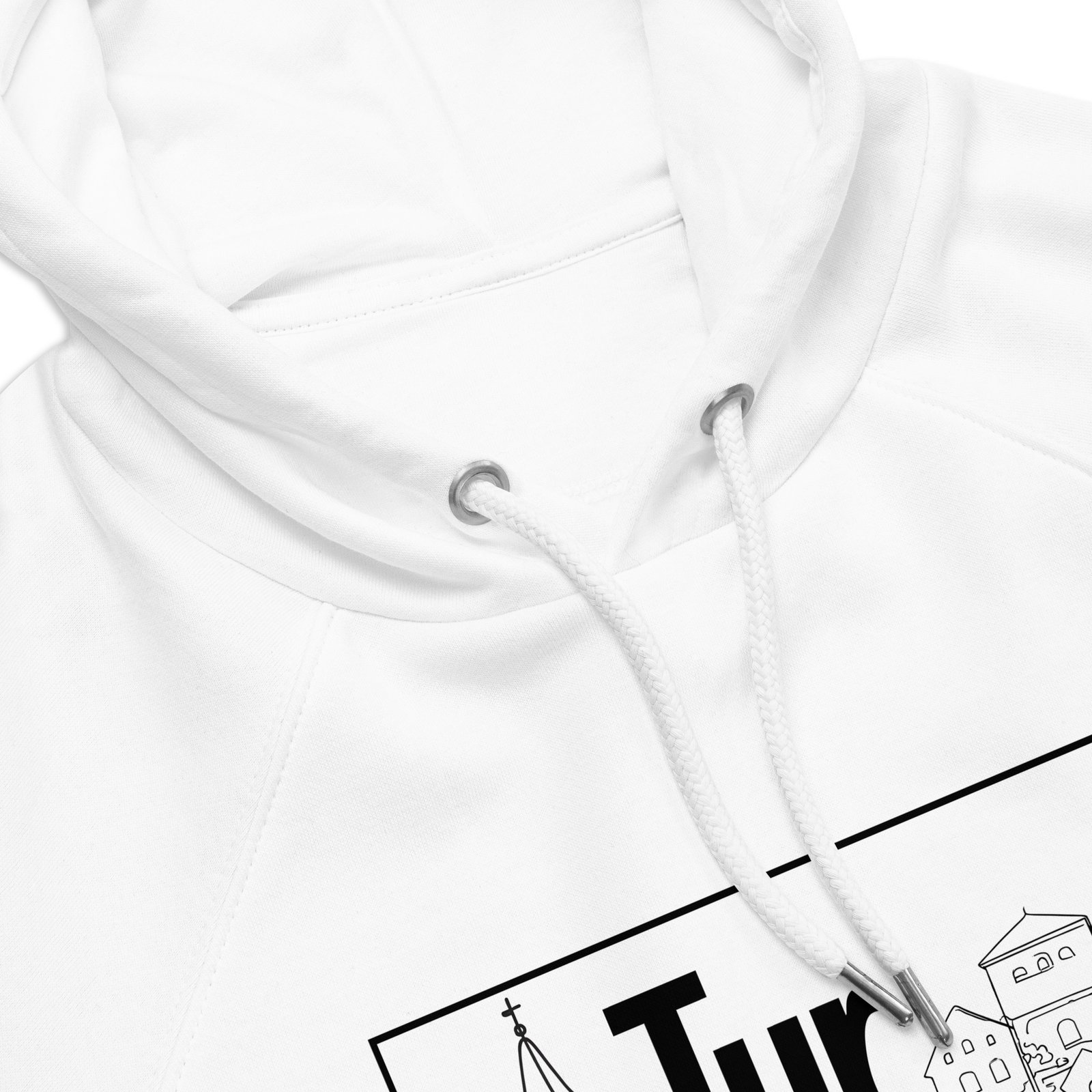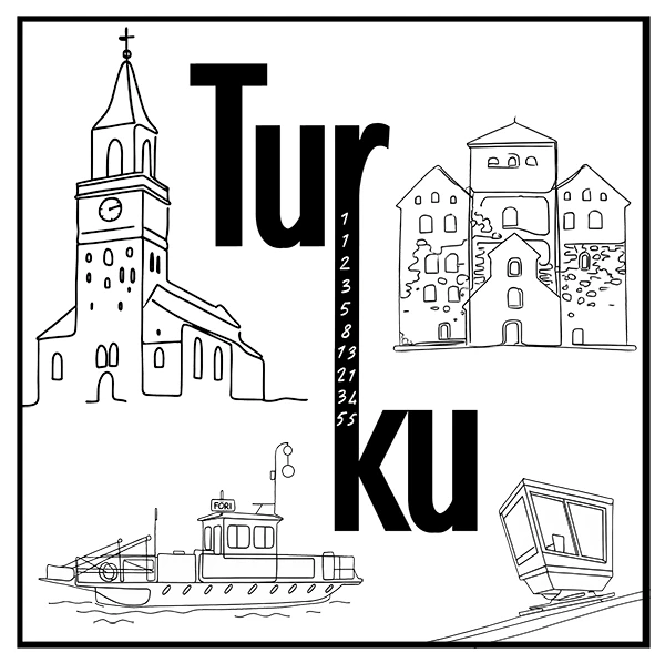 Unisex Huppari – Turun kiertotaulu ei ole vain paita. Se on lämmin matikkataulu, kunnianosoitus kaupungille ja mukavuuden manifesti yhdessä paketissa. Keskellä komeilee neliö, jonka sisällä tutut rivit: “Tur” ja “ku”. Kirjainten r ja k väliin on upotettu Fibonazzin piipunumerot. Turussa siis myös matikka on tyylikästä. Ja koska pelkkä numeroporno ei riitä, viereen on sommiteltu linjakkaat versiot Turun Tuomiokirkosta, Linnasta, Föristä ja Funikulaarista. Minimalistinen, mutta iskevällä sisällöllä.