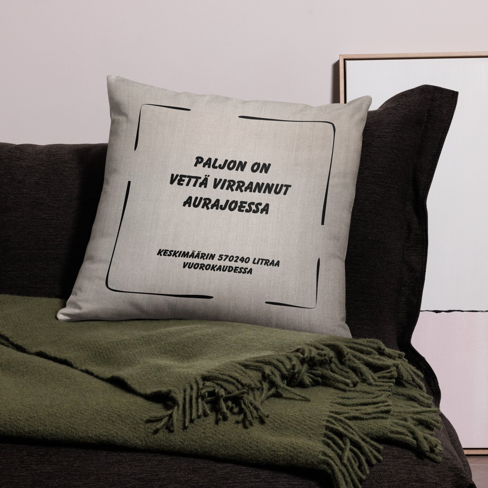 Paljon on vettä virrannut Aurajoessa, ja nyt se virtaa myös sohvallasi. Tämä sisustustyyny tuo kotiisi sekä historiallista syvyyttä että hyvää läppää, ihan kirjaimellisesti. Teksti “Paljon on vettä virrannut Aurajoessa” ei ole pelkkä sanonta, vaan alla komeileva tarkka lukema “keskimäärin 570240 litraa vuorokaudessa” nostaa sen uudelle tasolle. Tieto perustuu vuosien 1980–2018 Halistenkosken virtaamatietoihin, eli ei mitään mutuilua vaan faktaa Turun sydämestä.