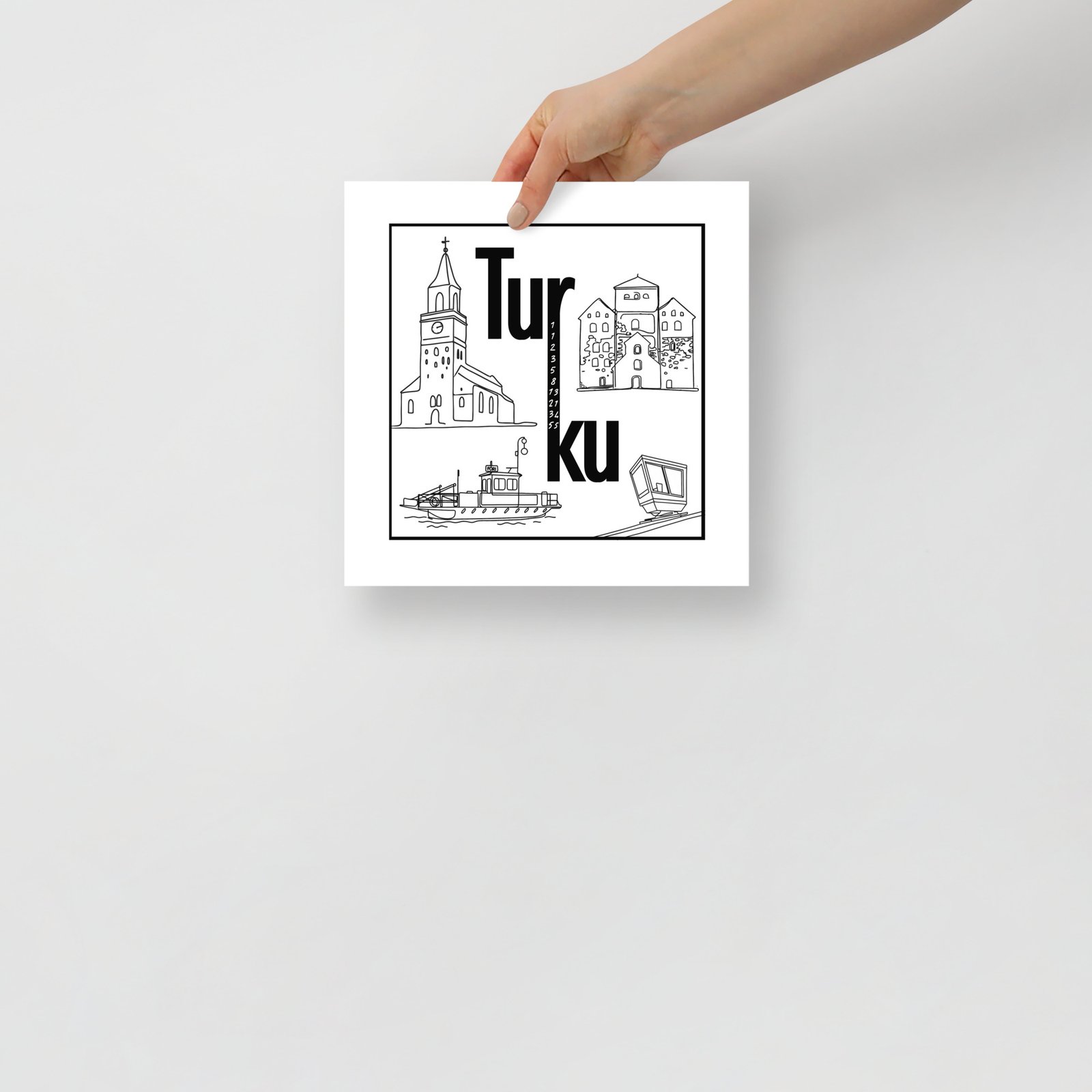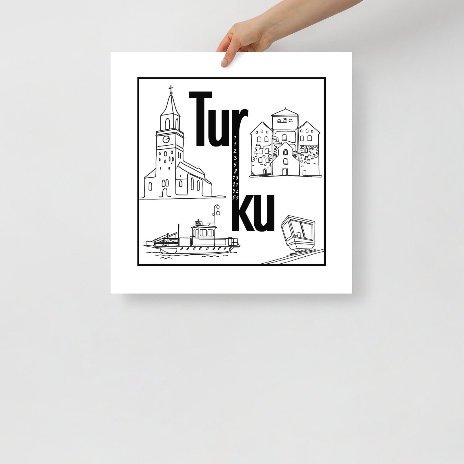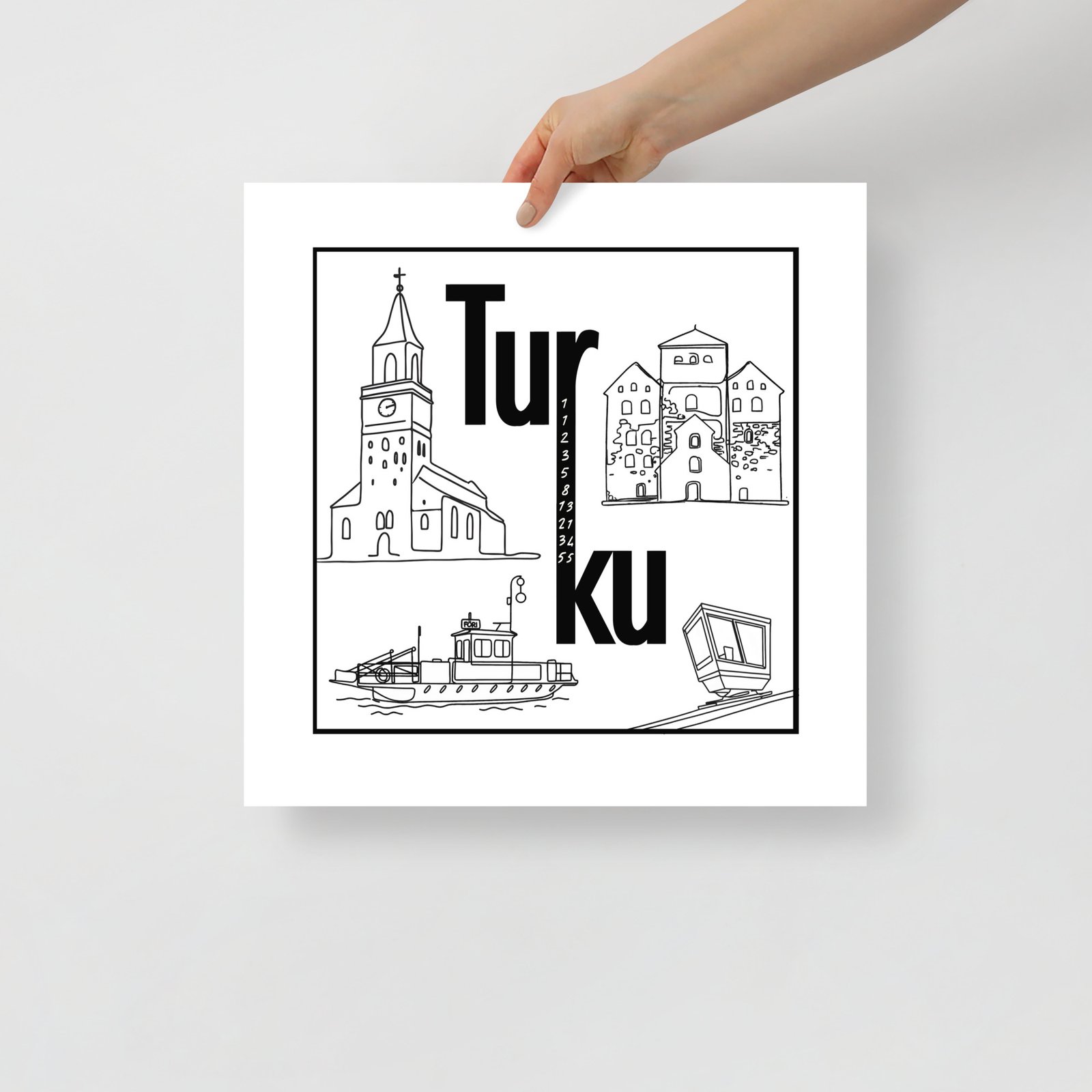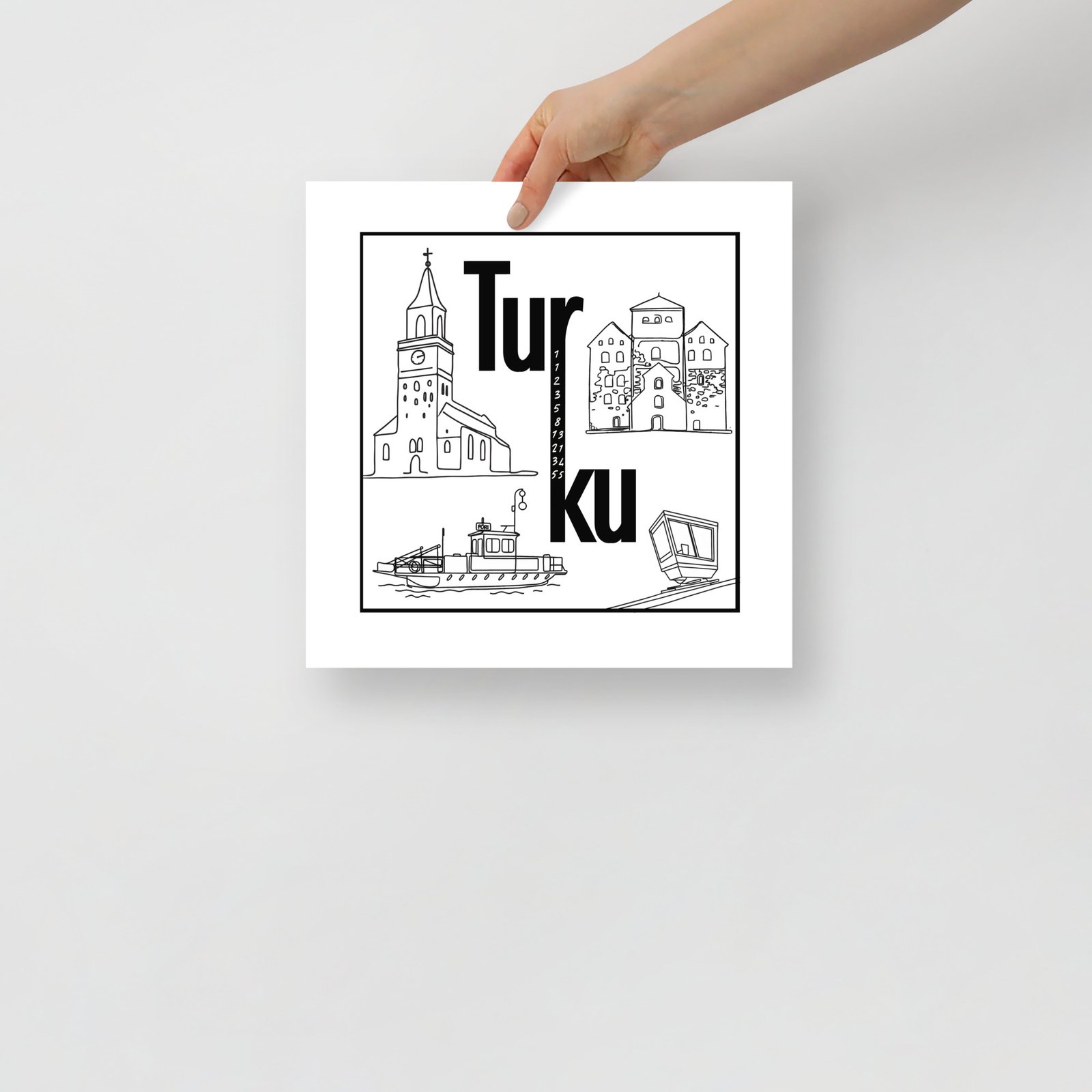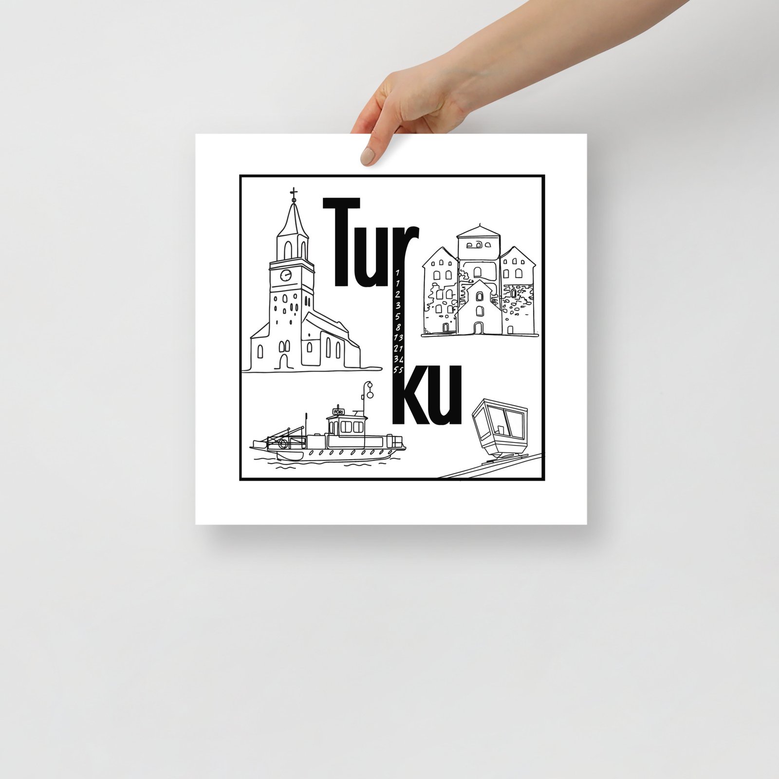 Juliste – Turun kiertotaulu ei huuda huomiota, mutta saa katsojan pysähtymään. Tämä neliön muotoinen mestariteos tiivistää Turun hengen minimalistiseen mutta älykkääseen designiin. Teksti “Tur” ylä- ja “ku” alarivillä näyttää yksinkertaiselta – mutta katso tarkemmin: r ja k on yhdistetty ja niiden väliin on upotettu Fibonaccin piippusarja. Tää on juliste niille, jotka arvostaa yksityiskohtia ja rakastaa logiikkaa. Turussa jopa seinätaide laskee.