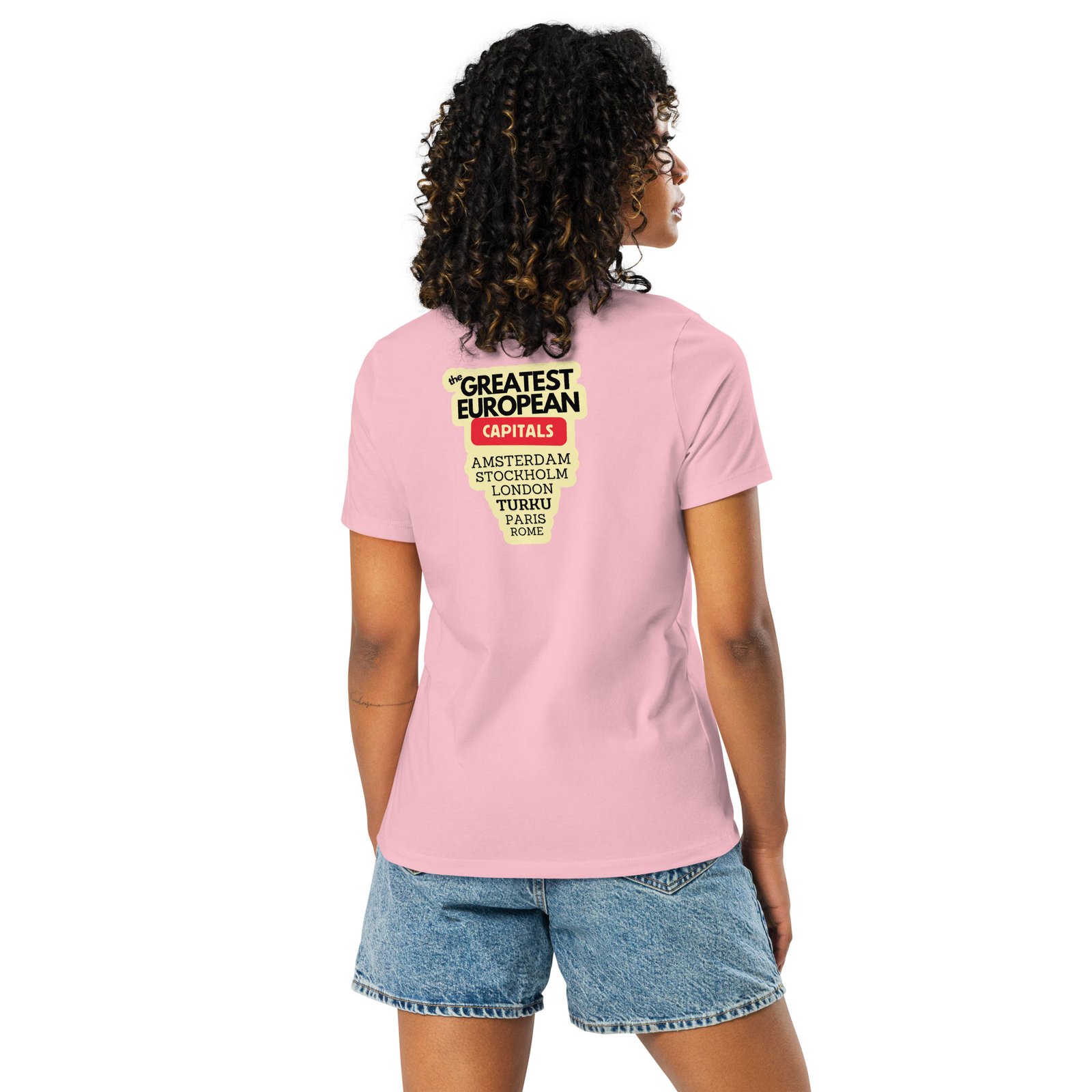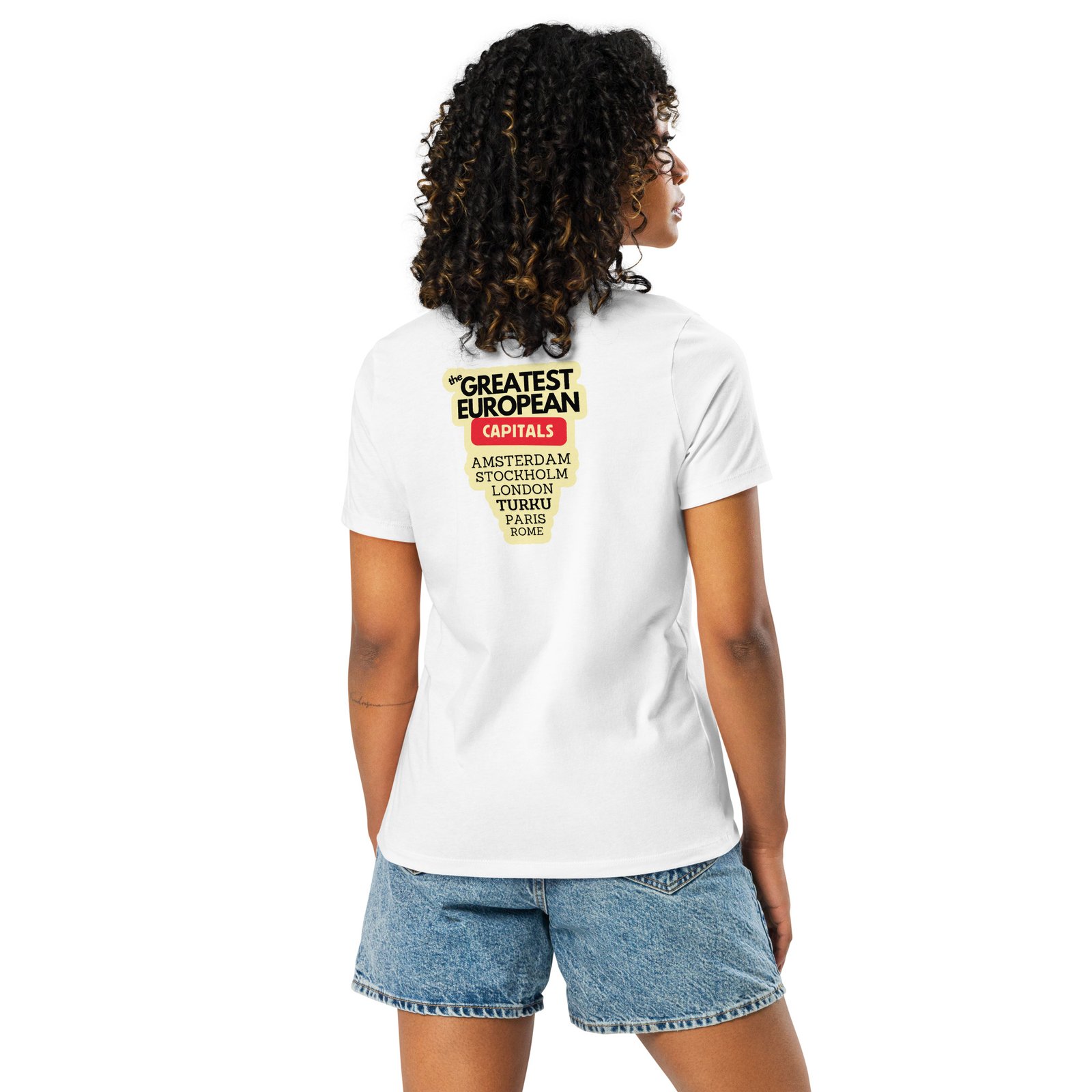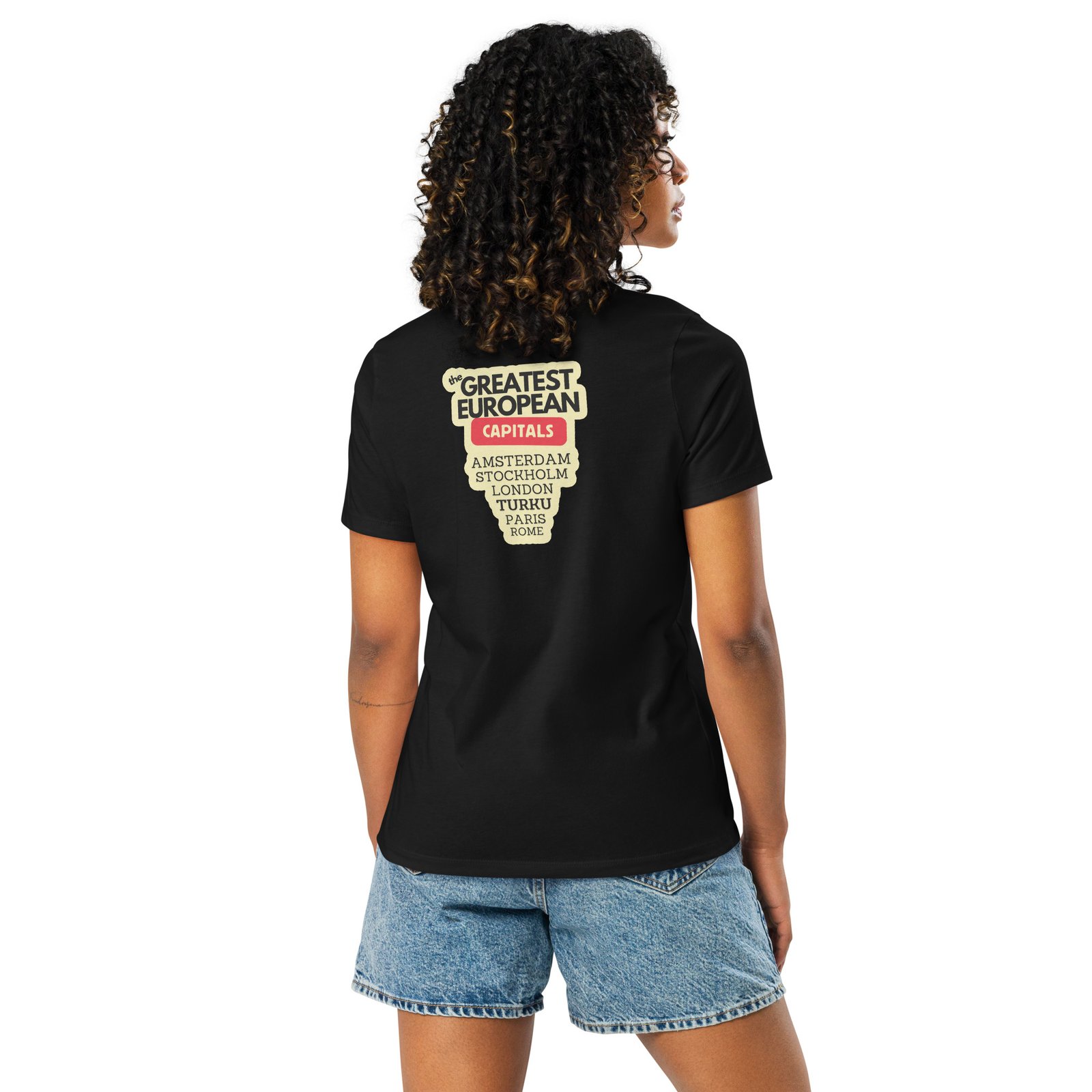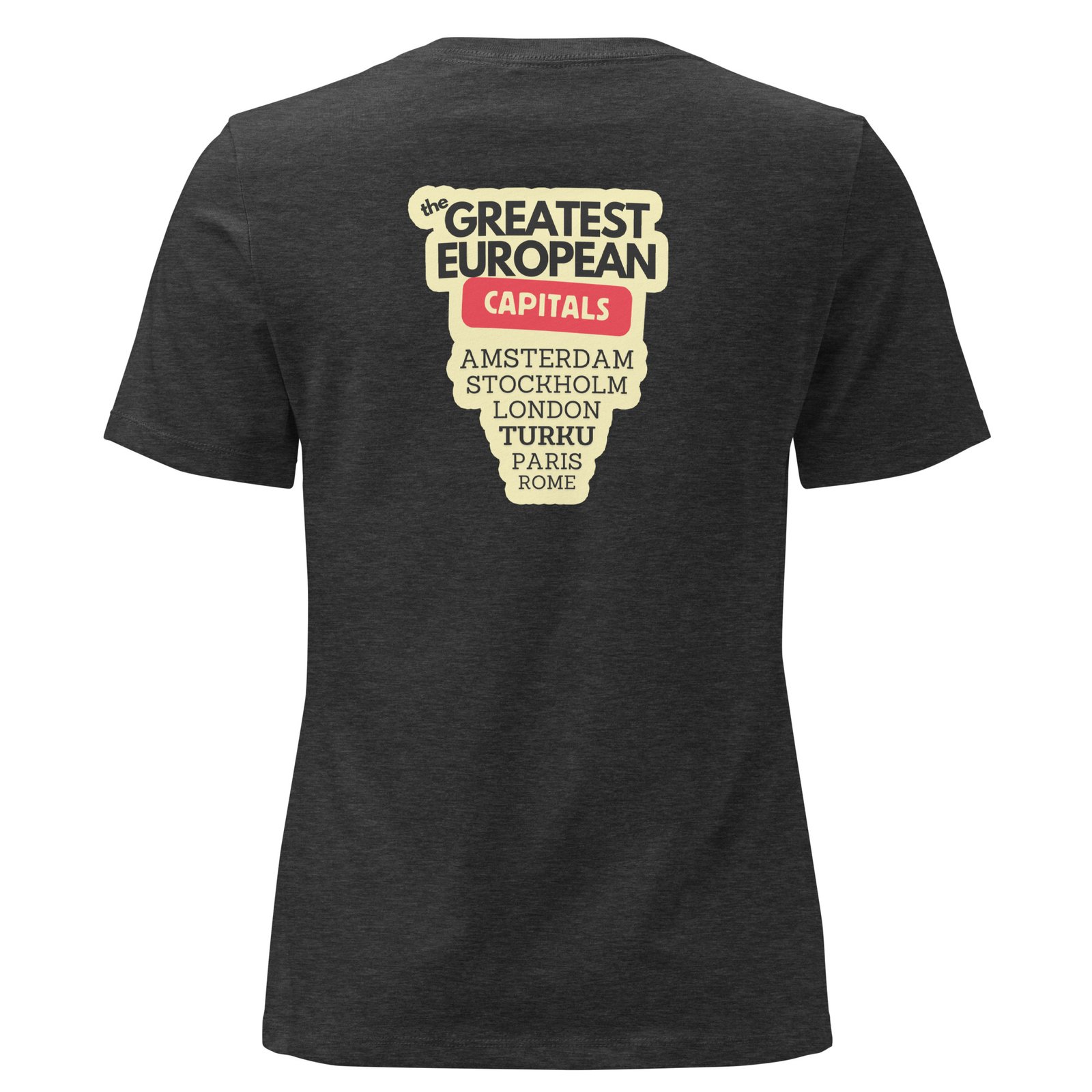 Naisten T-paita – Greatest European Capitals ei pelkästään pukeudu Euroopan tyyliin, vaan kirjoittaa Turun nimen historiaan. Selkäprintissä komeilee nimilista, joka näyttää suoraan lentokentän lähtötaululta: Amsterdam, Lontoo, Pariisi, Tukholma… ja tietenkin Turku. Eikä tässä listassa olla vitsillä mukana, vaan ihan vakavissaan. Tämä paita on sekä muotilausunto että maantieteellinen korjausliike.