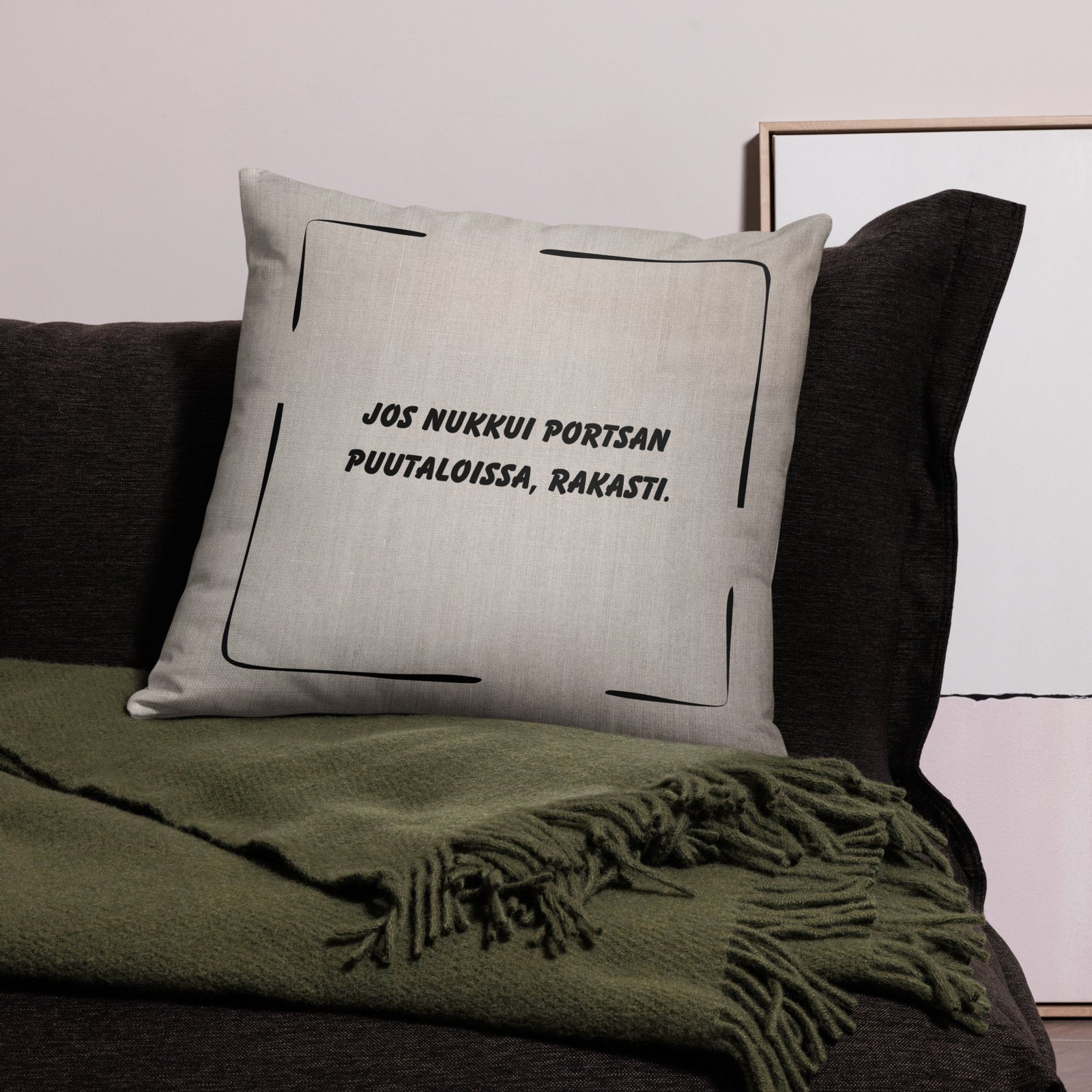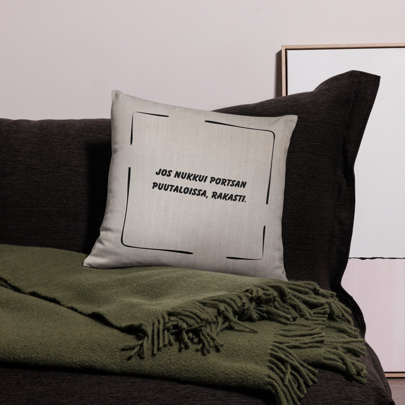 Tämä on juuri se yksityiskohta, joka tekee olohuoneestasi enemmän kuin huoneen. Se tekee siitä paikan, jossa ollaan läsnä. Tai ainakin ollaan. Ja kun vieras näkee tämän tyynyn, hän joko nyökkää ymmärtävästi tai kysyy, mikä ihmeen Portsa.