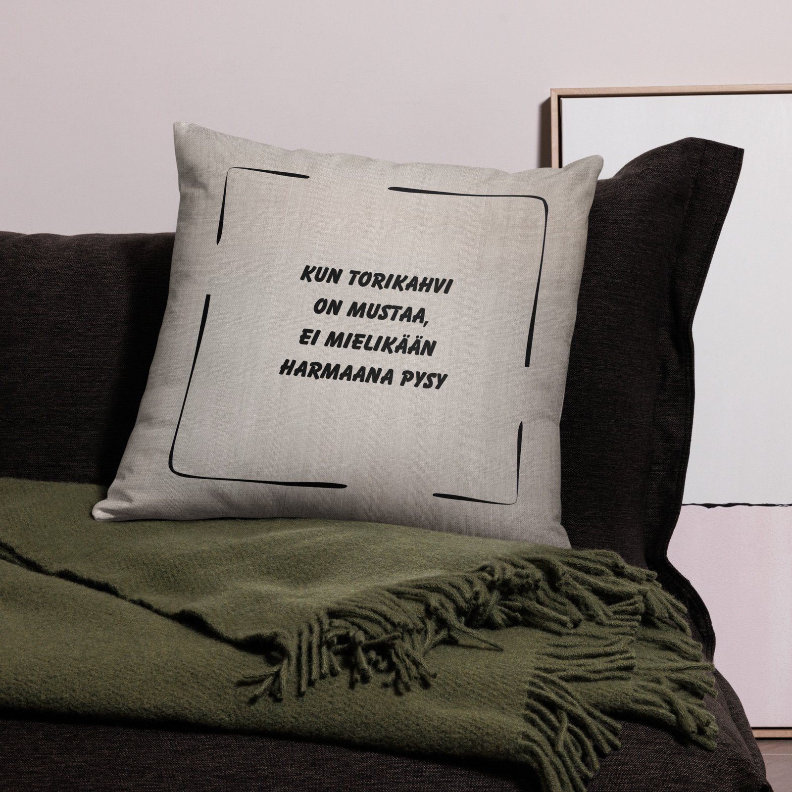 Kun torikahvi on mustaa, ei mielikään harmaana pysy. Tämä sisustustyyny tuo olohuoneeseen saman tunnelman kuin lämmin kupillinen kaffetta Turun kauppatorilla – rento, piristävä ja aivan vastustamaton. Teksti muistuttaa, että vaikka taivaalta sataisi tiskirättei, katei ja koirei, torikahvin voima on myrskyjäkin suurempi.